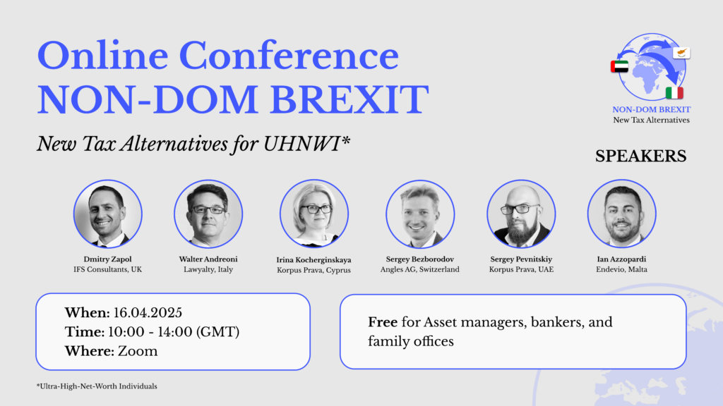 During the conference, leading experts will discuss new tax opportunities for UHNWI in the UK, UAE, Cyprus, Malta, Italy, and Switzerland. You will also have the opportunity to ask questions to the speakers.